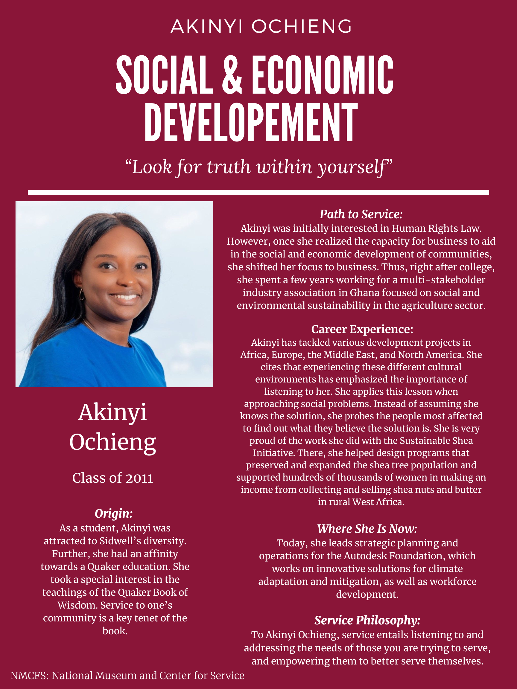 Akinyi was inspired by the Quaker education she received at Sidwell Friends and was always attracted to the diverse school community. She was also inspired by her father, who worked at the World Bank. Akinyi was initially interested in human rights law. However, she later learned about the capacity of the private sector, through business, to develop communities socially and economically. Later, right after college, she went to Ghana and spent time working with a multi-stakeholder industry association focused on social and environmental sustainability in the agriculture sector.